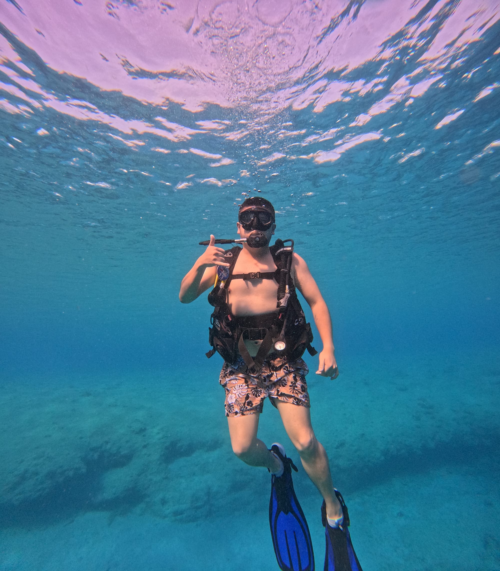 Por eso creo que es super importante ser honesto contigo mismo. Que no te detenga, anda, intenta. Pero si pasa algo, no tengas miedo en pedir ayuda o salir. Yo abri los ojos asi con el agua igual, luego limpie la boquilla, luego el visor y luego fui ascendiendo de a pocos para que la presion no me lastime mas el oido. Hay un botón que llena de aire el chaleco y con eso empezarás a flotar.
